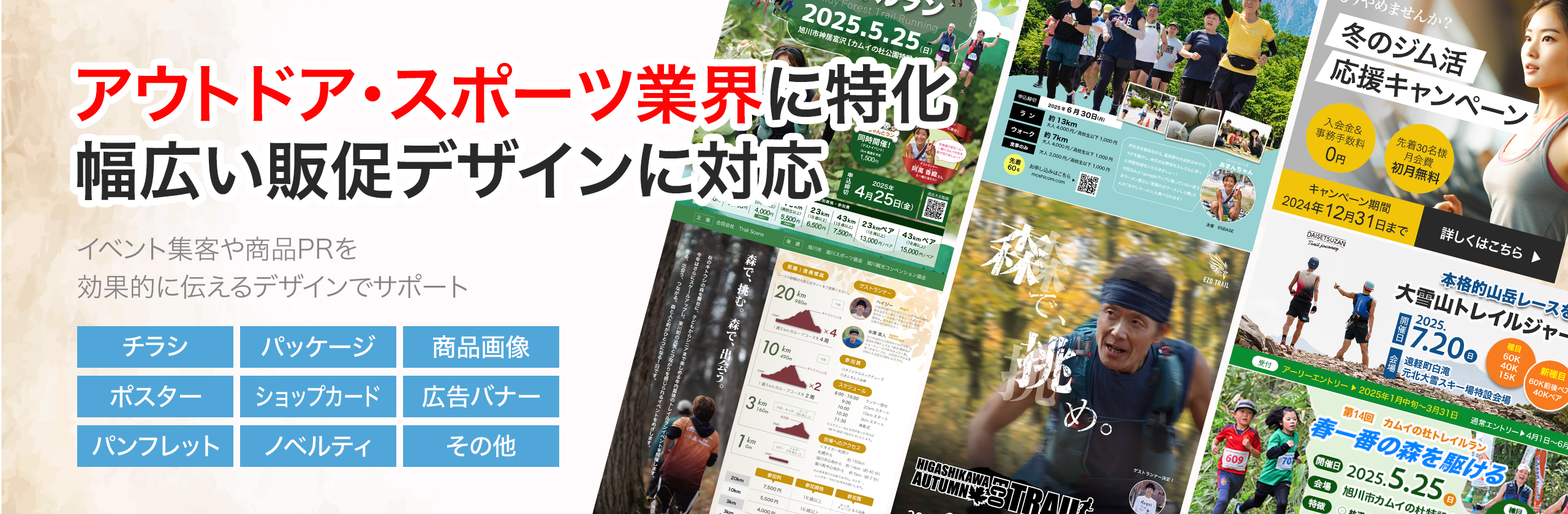 アウトドアメーカーでの販促物制作やショップ勤務の経験があり、 アウトドアやスポーツイベントなどの販促物が得意です。